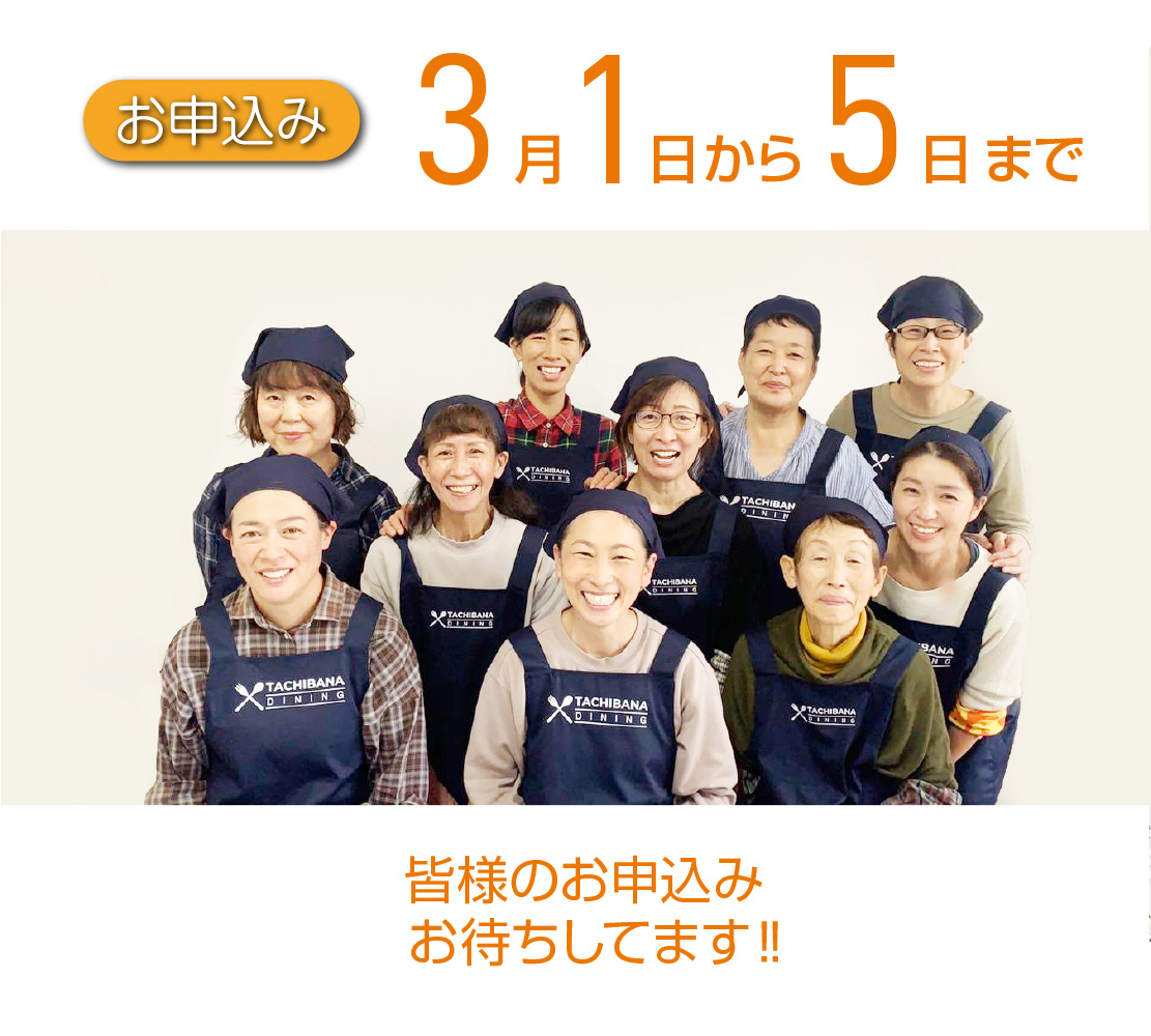 「たちばなダイニング」は「こどもが一人でも気軽に来られる」「毎日がんばっているママもちょっとお休みできる」「おじいちゃんおばあちゃんも憩える」来る人みんなが笑顔になれる居場所づくりを目指します。また、“3つのこしょく”を減らし、体の栄養と心の栄養になる食事づくりに取り組んでいきます。